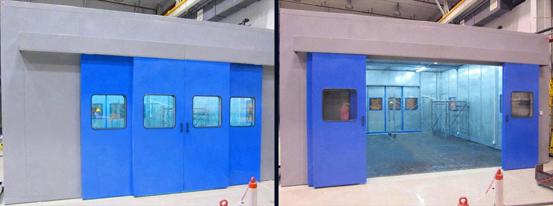 The main feature of this soundproof room is its electrically operated sliding door system, which opens in a four-panel folding configuration with left and right movement.