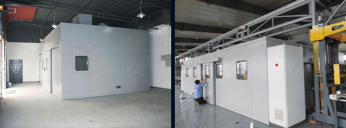 This soundproof enclosure is designed for plasma and supersonic spraying applications, suitable for noise reduction during spray processing of workpieces of any size.