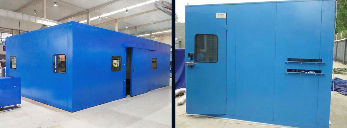Easy assembly/disassembly, durability of up to 10 years, equipped with inlet/outlet vents for convenient workpiece handling. Observation windows feature tinted soundproof glass.