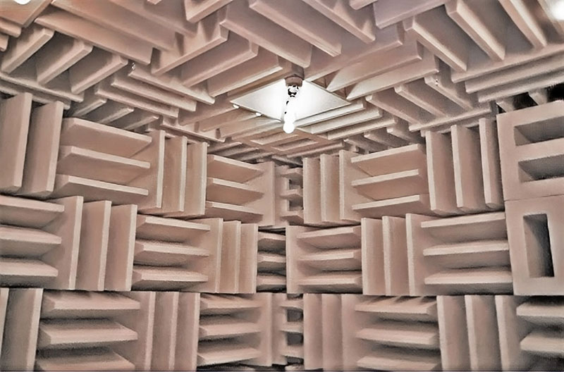 This anechoic chamber has sound-absorbing doors that can be opened and closed along an L-shaped track.